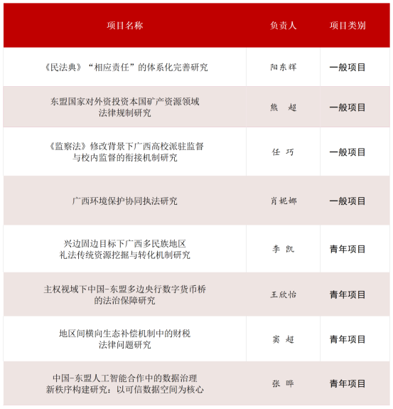 近日,广西壮族自治区哲学社会科学工作办公室正式下发2025年广西哲学社会科学研究年度课题立项通知书,我院共有8位教师的课题成功获得立项支持,其中一般项目4项,青年项目4项,创造了法学院在广西哲社课题立项数量的历史新高,充分彰显了我院的学科科研实力与未来发展潜力。