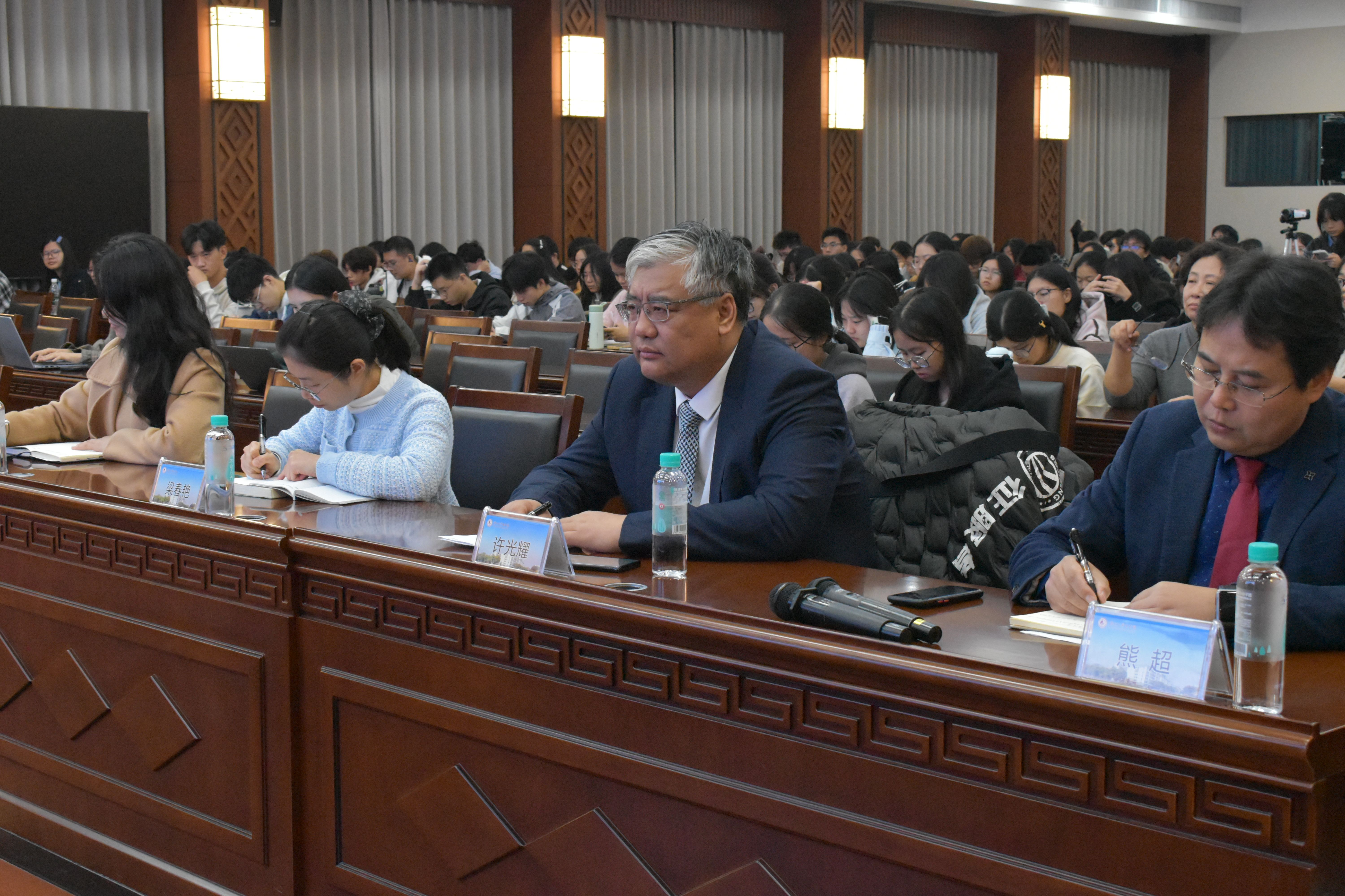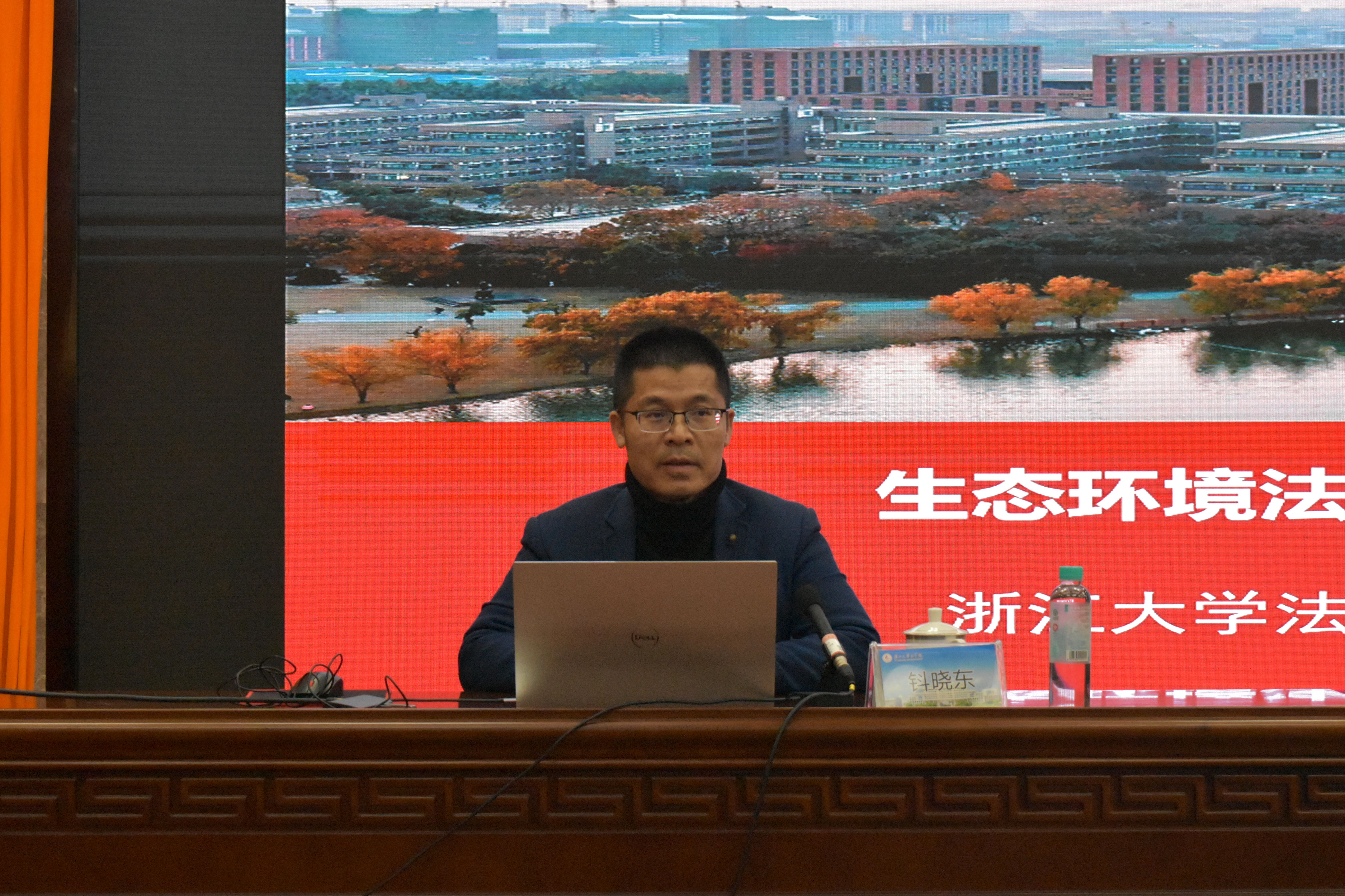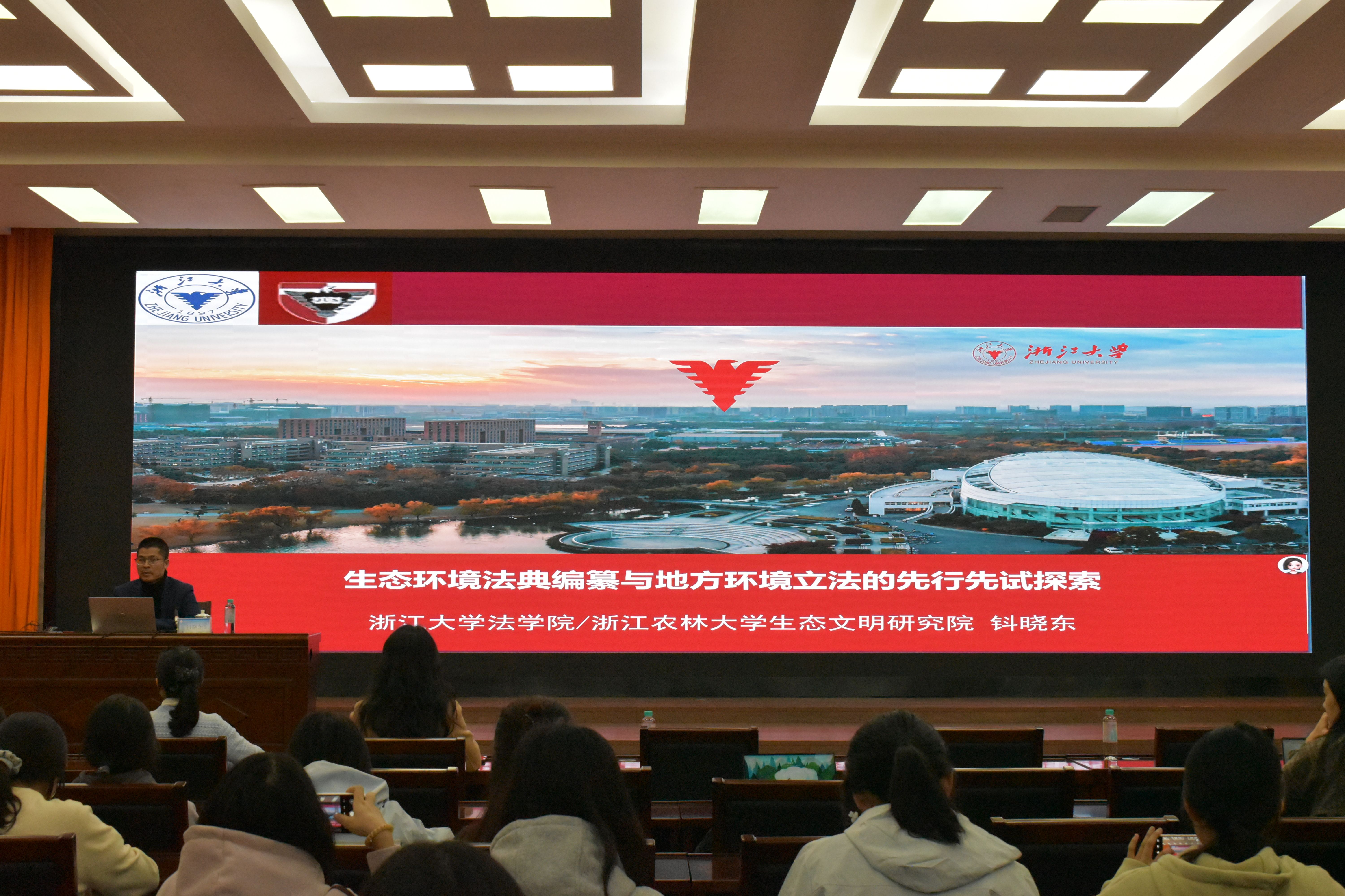 为助力法学学子精准把握生态环境法治前沿动态,拓宽学术研究与职业发展视野,应我院邀请,浙江大学博士生导师钭晓东教授于11月19日晚在君武馆玉林厅为我院师生作“承典启新:生态文明法治先行探索与生态环境法典编纂进阶”主题讲座。法学院院长许光耀等领导、教师代表与全体学子共同参会,讲座由副院长熊超主持。