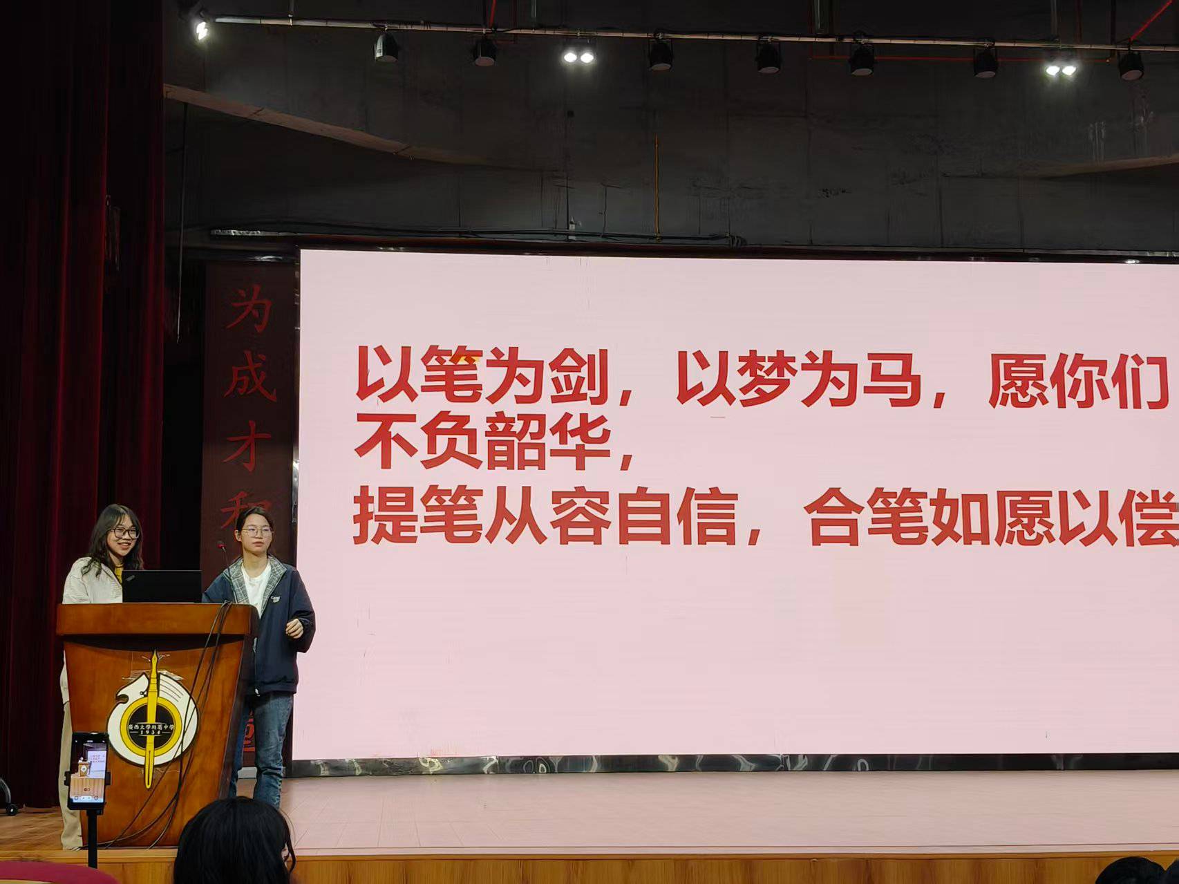 唐艺芸同学和李冉然同学则以饱满的热情,鼓励台下满怀憧憬的学弟学妹们“以梦为马,不负韶华”。面对一张张稚嫩而坚定的脸庞,两位同学充分展现了西大学子的自信昂扬与意气风发,真诚寄语:“前路漫漫亦灿灿,愿同学们每一次前行都步履坚定,愿每一份努力都不被辜负。”
