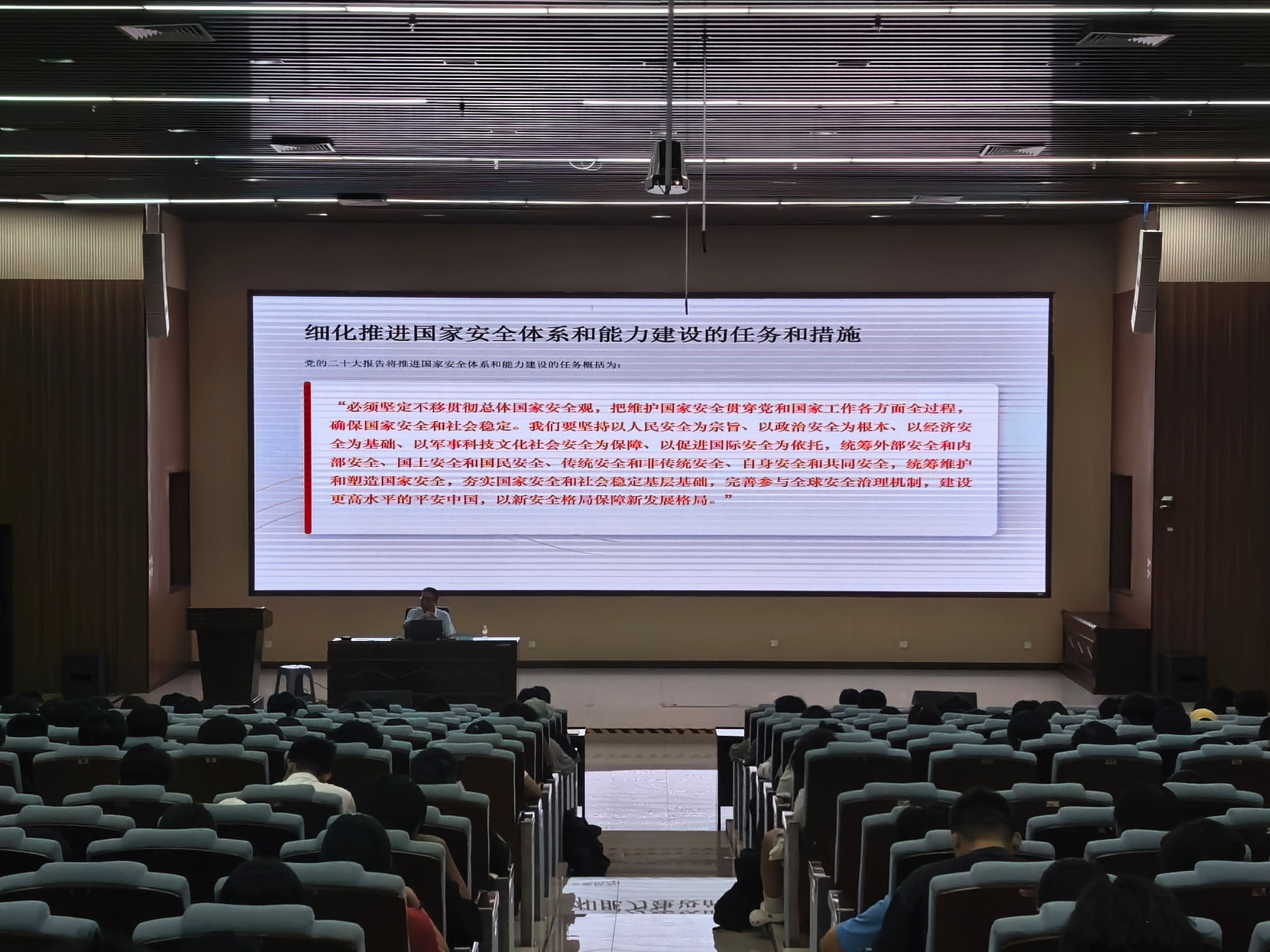 专题报告环节,高一飞教授围绕总体国家安全观与国家安全相关法律法规展开系统宣讲。报告站位高远、内涵丰富、案例鲜活、深入浅出,既完整阐释了总体国家安全观的核心要义,精准解读了国家安全领域相关法律法规的核心条款与实践要求,又紧密结合高校办学实际与青年学生成长特点,清晰点明了新时代青年学子在维护国家安全中的责任使命与行动方向,为在场师生上了一堂兼具理论深度与实践指导意义的法治教育课、国家安全启蒙课,赢得了现场师生的热烈掌声。